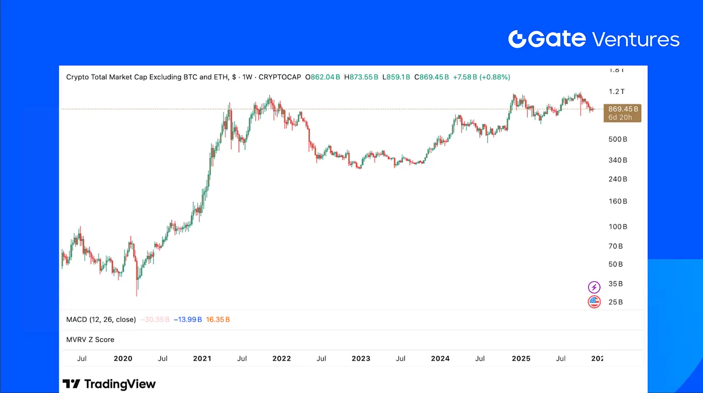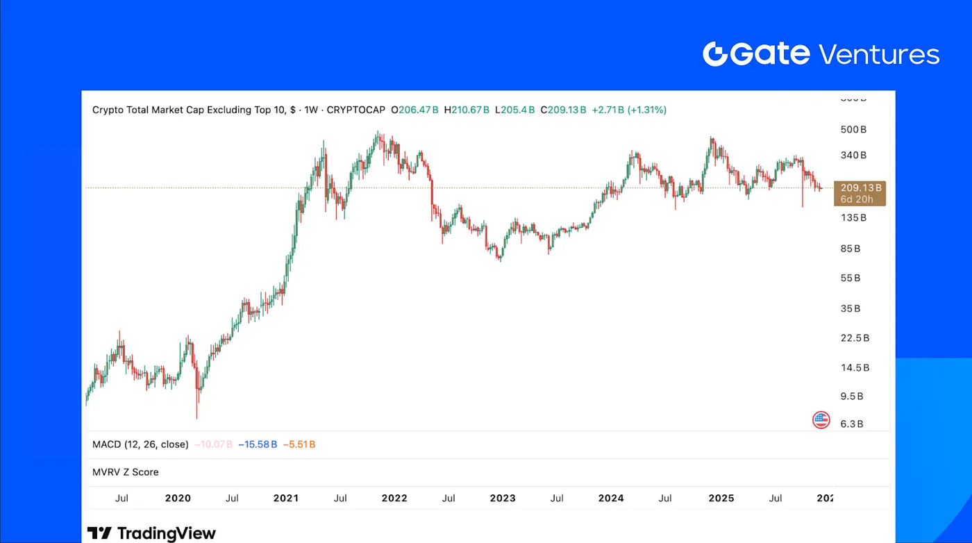 剔除 BTC 和 ETH 後,市場下跌 1.1%;更廣泛的山寨幣板塊(剔除前十大幣種)跌幅達 3.88%,反映上週山寨資產流動性持續收縮。