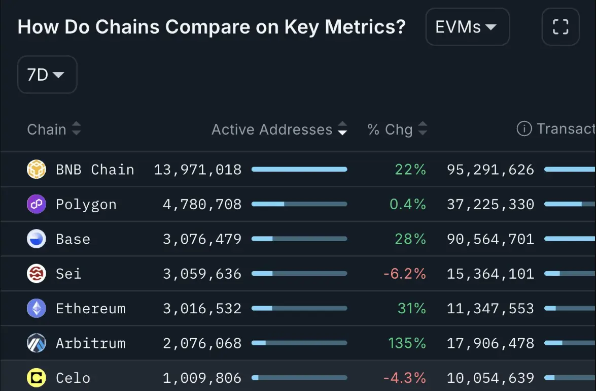 根據 Nansen 數據,Arbitrum 剛剛創下過去一週增長最快的 EVM 區塊鏈記錄,活躍地址數突破 200 萬,較上週暴增 135%。儘管如此,BNB Chain 仍以近 1,400 萬活躍地址穩坐市場第一,Polygon 和 Base 分別以 470 萬和 300 萬活躍地址位居其後。
