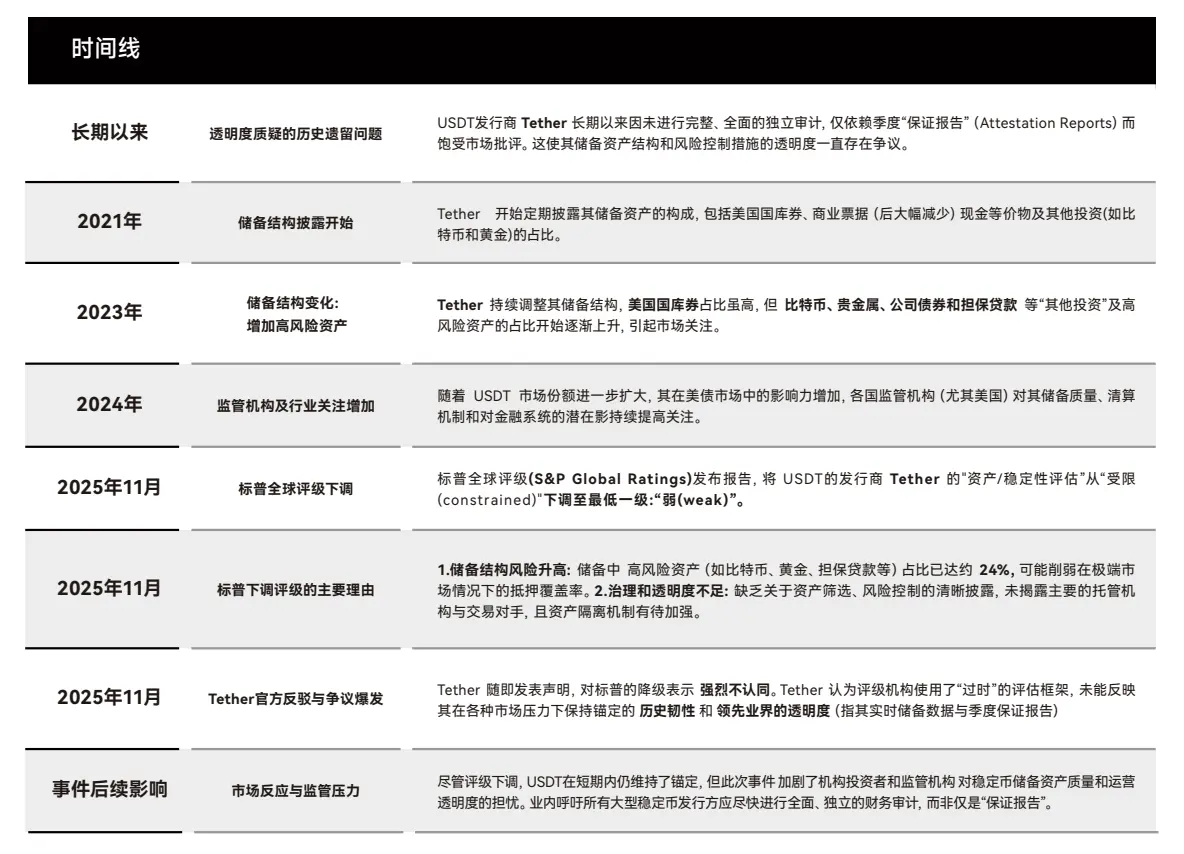 2025 年 11 月,標普全球將 USDT 的「資產/穩定性評估」從「受限(constrained)」下調至「弱(weak)」,核心理由有二: