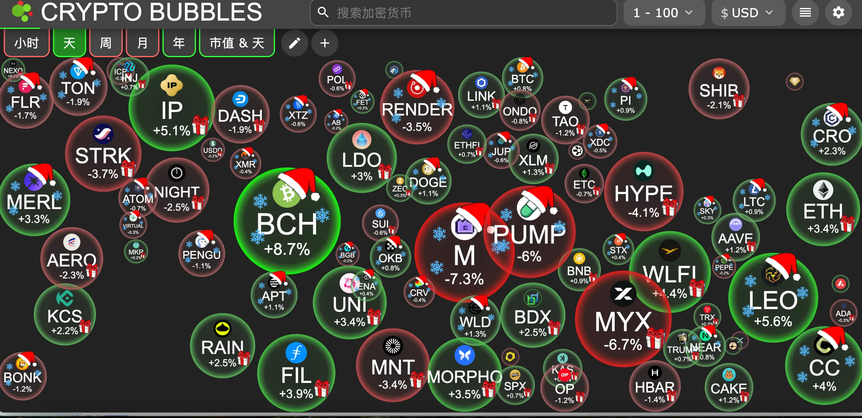 今日市值前100幣種最大漲幅:Bitcoin Cash漲8.7%、LEO Token漲5.6%、Story漲5.1%、World Liberty Financial漲4.4%、Canton Network漲4%。