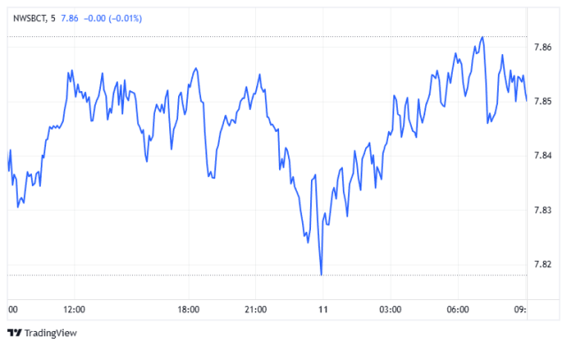 NWSBCT (藍籌股指數): NWSBCT 指數在午夜左右觸及約7.818的日內低點後,展現出明確的“V型”反彈。早晨反彈強勁,突破中間阻力,達到約7.865的高點。雖然在此局部阻力位遇到小幅回落,但指數仍在早晨範圍的高端交易,顯示買盤在當前支撐位持續活躍。