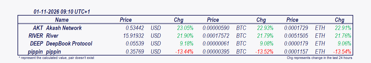 #### 近24小時內變動最大之代幣與幣種:**09:00 CET – 今晨脈動:市場普遍復甦,隔夜波動後的反彈*** **Akash Network 和 River** 自午夜以來漲幅達15.25%。Akash Network 上漲12.99%。**概述:** 隔夜市場呈現大幅波動,隨後逐步回升。在一段區間震盪後,午夜左右出現急速賣壓,測試較低的流動性區域。然而,清晨時段出現強勁反轉,價格持續上漲,動能穩定。市場已成功收復大部分失地,顯示日內反彈具有韌性。**🔍 市場洞察:** NWST1100 指數上漲0.17%,顯示在隔夜下跌後趨於穩定。像 Akash Network (AKT) 和 River (RIVER) 這些資產展現出明顯的抗跌性,顯著跑贏大盤指標。有趣的是,比特幣和以太幣幾乎同步移動,兩者漲幅約0.08-0.09%。這或許代表市場已趨於穩定,但歷史經驗提醒,這種平靜期常常預示著即將出現劇烈波動。由於上行阻力接近,市場仍處於微妙平衡中。**NWSBCT (藍籌股指數):** NWSBCT 指數在午夜左右觸及約7.818的日內低點後,展現出明確的“V型”反彈。早晨反彈強勁,突破中間阻力,達到約7.865的高點。雖然在此局部阻力位遇到小幅回落,但指數仍在早晨範圍的高端交易,顯示買盤在當前支撐位持續活躍。*本次更新涵蓋過去24小時的市場活動,截止時間為09:00 CET。主要變動包括24小時表現,但重點在於自午夜以來變動最大之資產。**2100NEWS 指數**顯示00:00至09:00 CET的變化。**2100NEWS 總指數 (NWST1100)** 及比特幣與以太幣部分始終反映完整24小時變化,無論報告時間為何。請注意,自發布以來,市場狀況可能已變。比特幣與以太幣之間的表現分類 (為:重要、輕微、相似),基於其歷史波動率的統計分析。**補充說明詳細列出這些特定加密貨幣與指數的篩選標準。*** **Akash Network (AKT)**| || --- || *2100NEWS 排名:241,中型非以太坊幣,指數成員:NWST1100、NWSM200、NWSCo100* || ***2100NEWS DA 委託簿品質評價等級:** 差,分數:9.8 (平均幣種:15.1)* |Akash 是一個去中心化雲端運算市場。它是一個為 DeFi 設計的去中心化雲端 (decloud),能釋放 8.4 百萬個資料中心中 85% 的閒置雲端運算容量。Akash 允許任何人買賣未使用的運算能力。Akash 網絡是建立在 Cosmos hub 上的完全自主的權益證明區塊鏈。它使用原生功能性代幣 Akash token (Akt) 作為治理和保護區塊鏈的主要手段,並提供一個預設的存儲與交換價值機制。Akt 將作為 Akash 多貨幣和多鏈生態系統中的儲備貨幣,並通過質押確保平台公共區塊鏈的經濟安全。我們正分階段實施 Akash 通行證的經濟模型。為了適當補償網絡供應商,我們將首先穩定質押設置,以建立 Akt 在主網1發布時的經濟價值。在完成初期網絡指導階段後,我們將開始研究 Akash 的經濟模型,以鼓勵供應商提供更低價格,並促使質押者長期參與網絡。 **River (RIVER)**| || --- || *2100NEWS 排名:313,小型以太坊幣,指數成員:NWST1100、NWSS300* || ***2100NEWS DA 委託簿品質評價等級:** 差,分數:5.3 (平均小型幣:10.4)* |River 正在建立一個鏈抽象穩定幣系統,連結資產、流動性與收益,跨越多個生態系統。由 omni-CDP 穩定幣 satUSD 支持,用戶可以在不同生態系統中賺取、槓桿和擴展。除了傳統模型外,River 率先推出 PrimeVault 和 SmartVault,結合抵押品彈性與自動化、無清算的收益策略,實現無縫多鏈擴展。 **DeepBook 協議 (DEEP)**| || --- || *2100NEWS 排名:211,中型非以太坊幣,指數成員:NWST1100、NWSM200、NWSOT50、NWSDM100* || ***2100NEWS DA 委託簿品質評價等級:** 差,分數:10.2 (平均非以太坊幣:13.6)* |DeepBook 是一個建立在 Sui 上的新一代去中心化中央限價委託簿 (CLOB)。DeepBook 利用 Sui 的平行執行、多秒延遲和低交易費用,打造高性能、超快的鏈上交易所。DeepBook 的委託簿架構提供深度且緊湊的流動性,實現鏈上交易的前沿價格執行。對於流動性提供者來說,DeepBook 比傳統自動做市商模型提供更強的價格控制能力,更適合高階流動性供應。作為 Sui DeFi 的主要批發流動性平台,DeepBook 被定位為生態系統內多種金融服務的基礎流動性提供者。