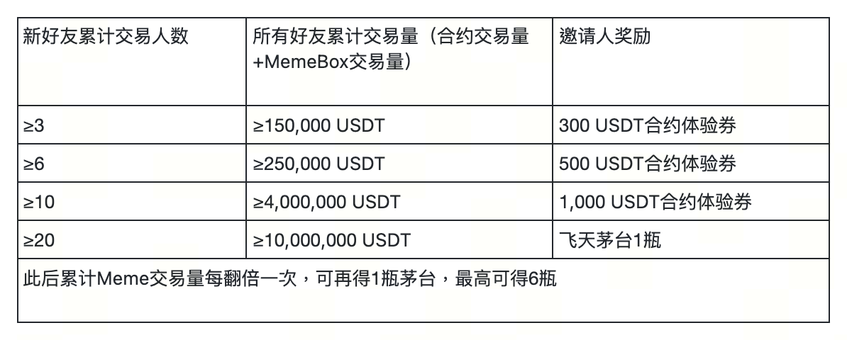邀请好友完成合约交易或MemeBox交易,所有好友组队累计完成指定交易量,您可最高赢6瓶整箱飞天茅台(可折现)。奖励共计50,000 USDT 合约体验券以及30瓶飞天茅台,先到先得。