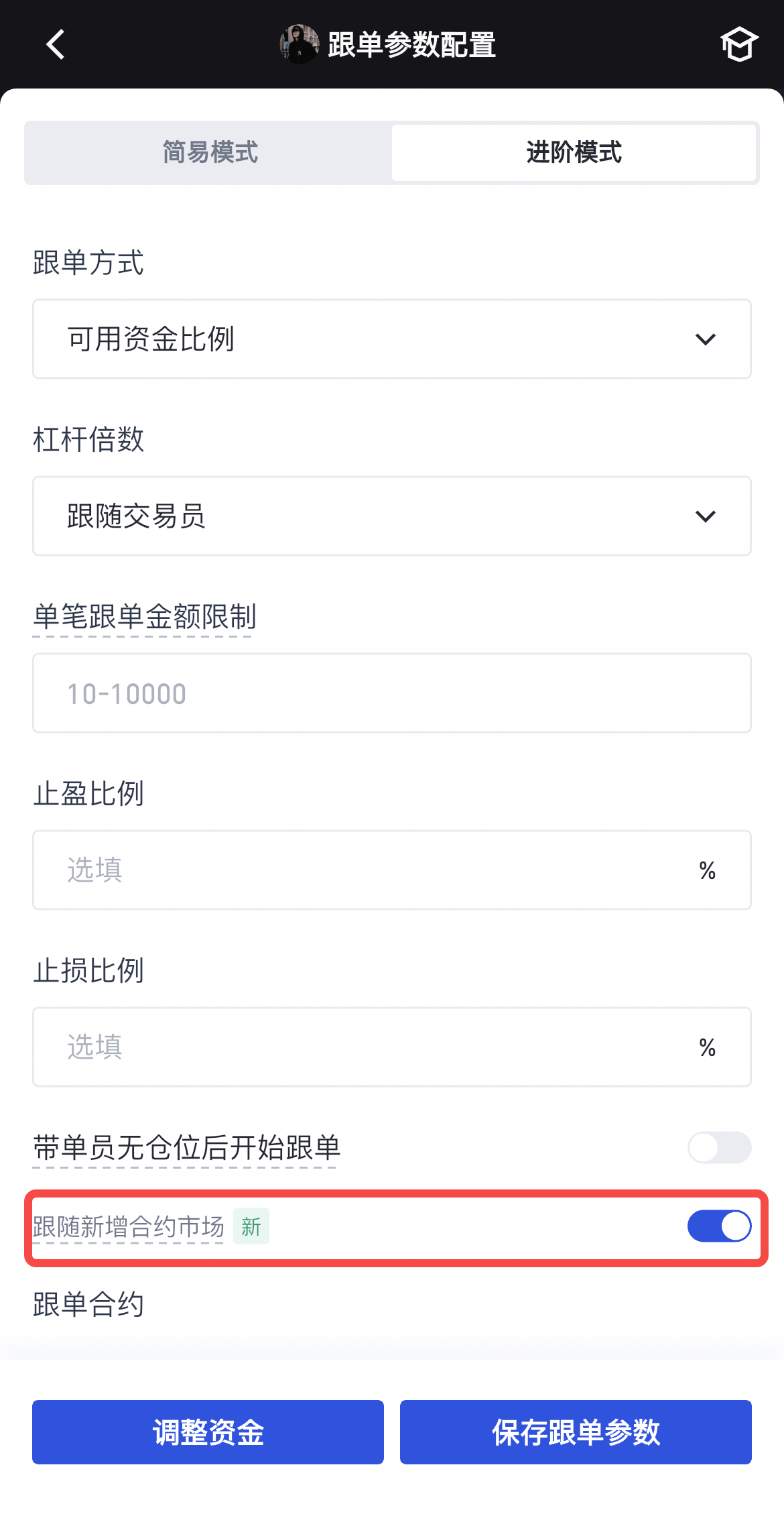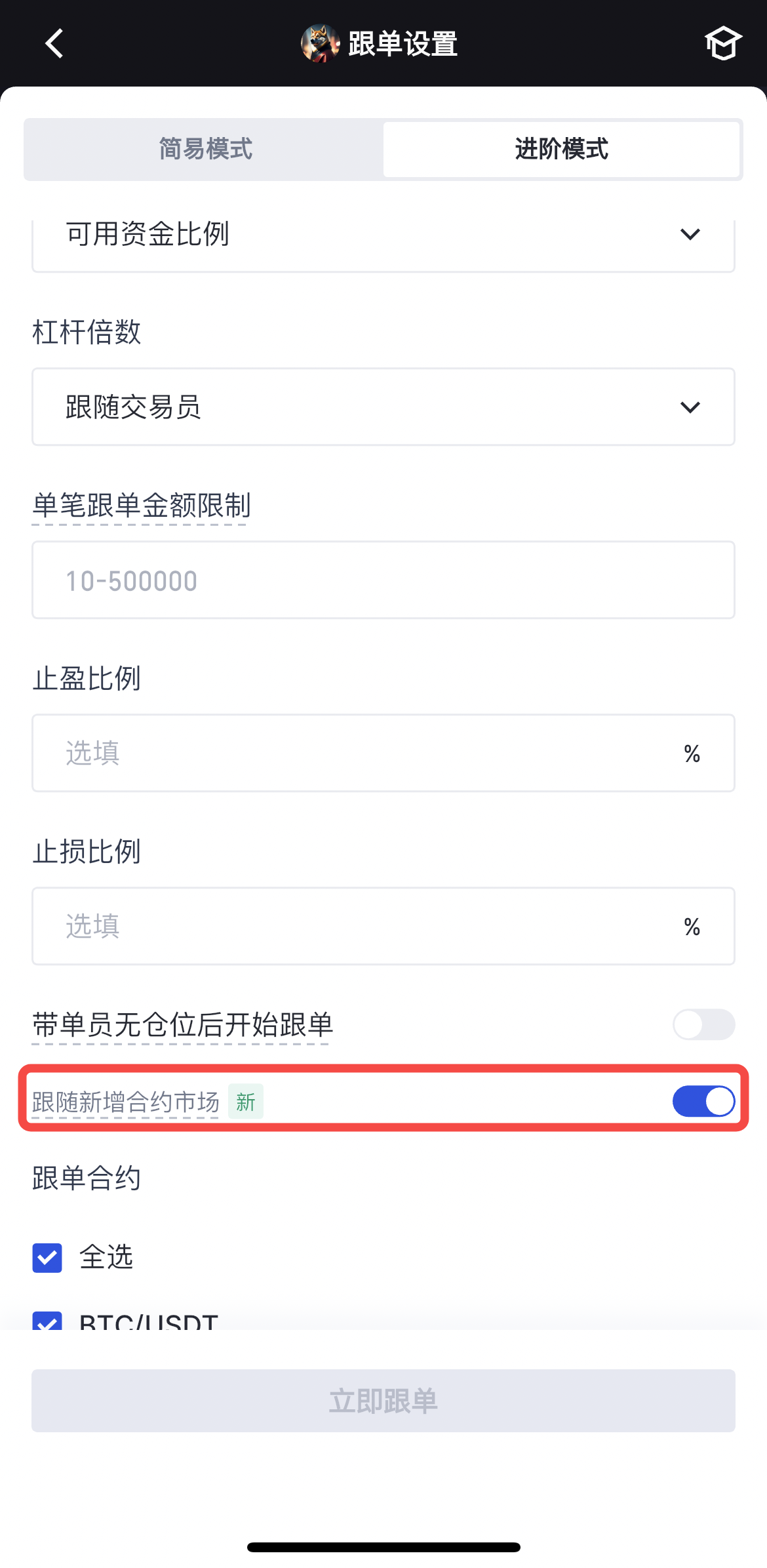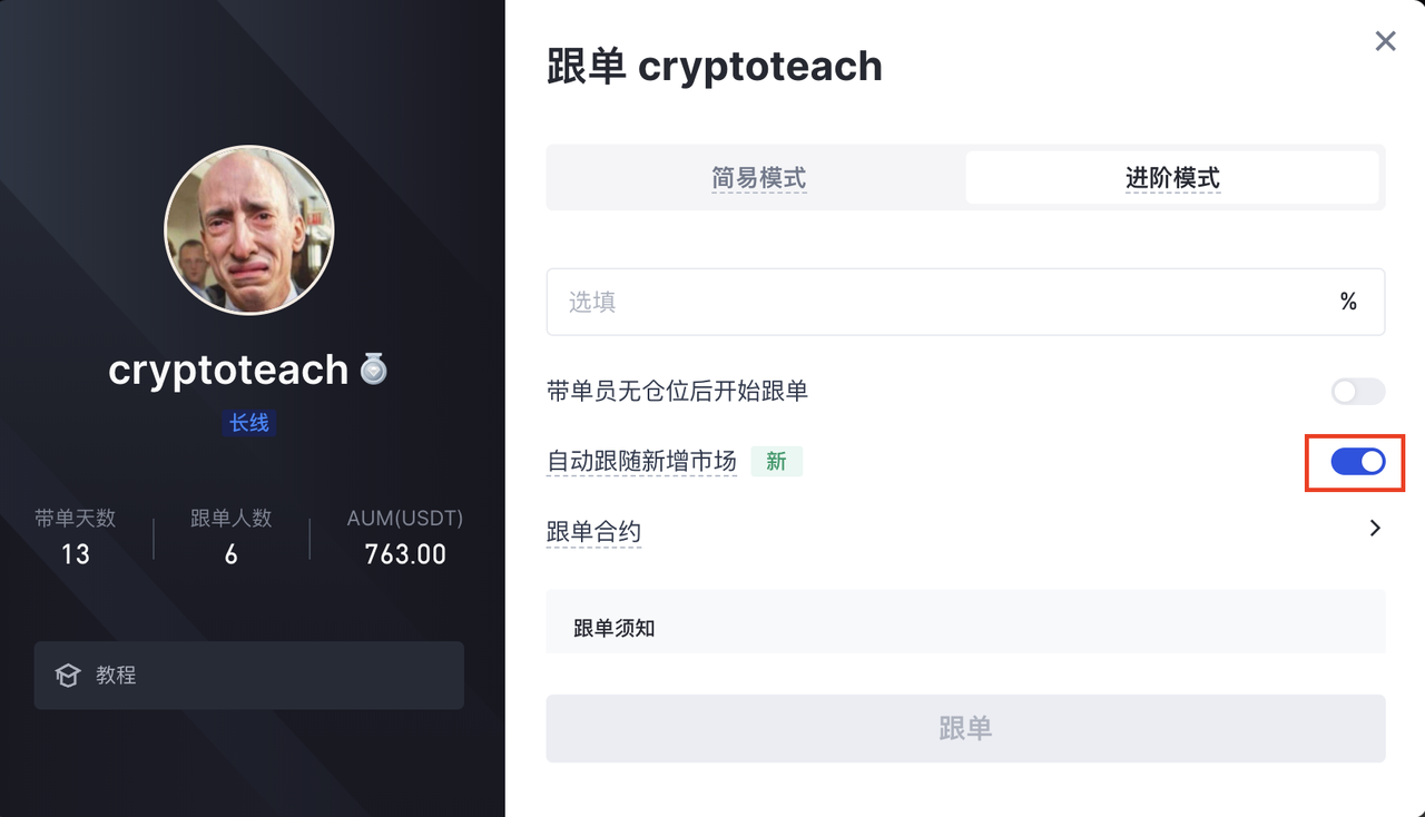 跟单用户开启此设置后,当交易员增加新的合约市场或带单新上架的合约市场,跟单用户将自动跟随新增合约市场。