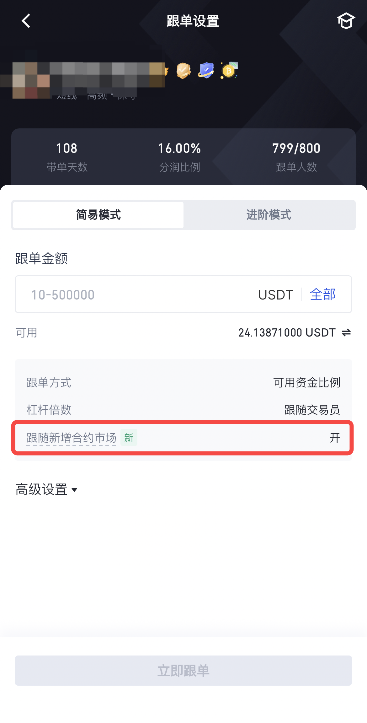 进阶跟单模式:点击“我的实盘” - 选择交易员进行跟单 - “进阶模式” - “高级” - 勾选“自动跟随新增市场”。