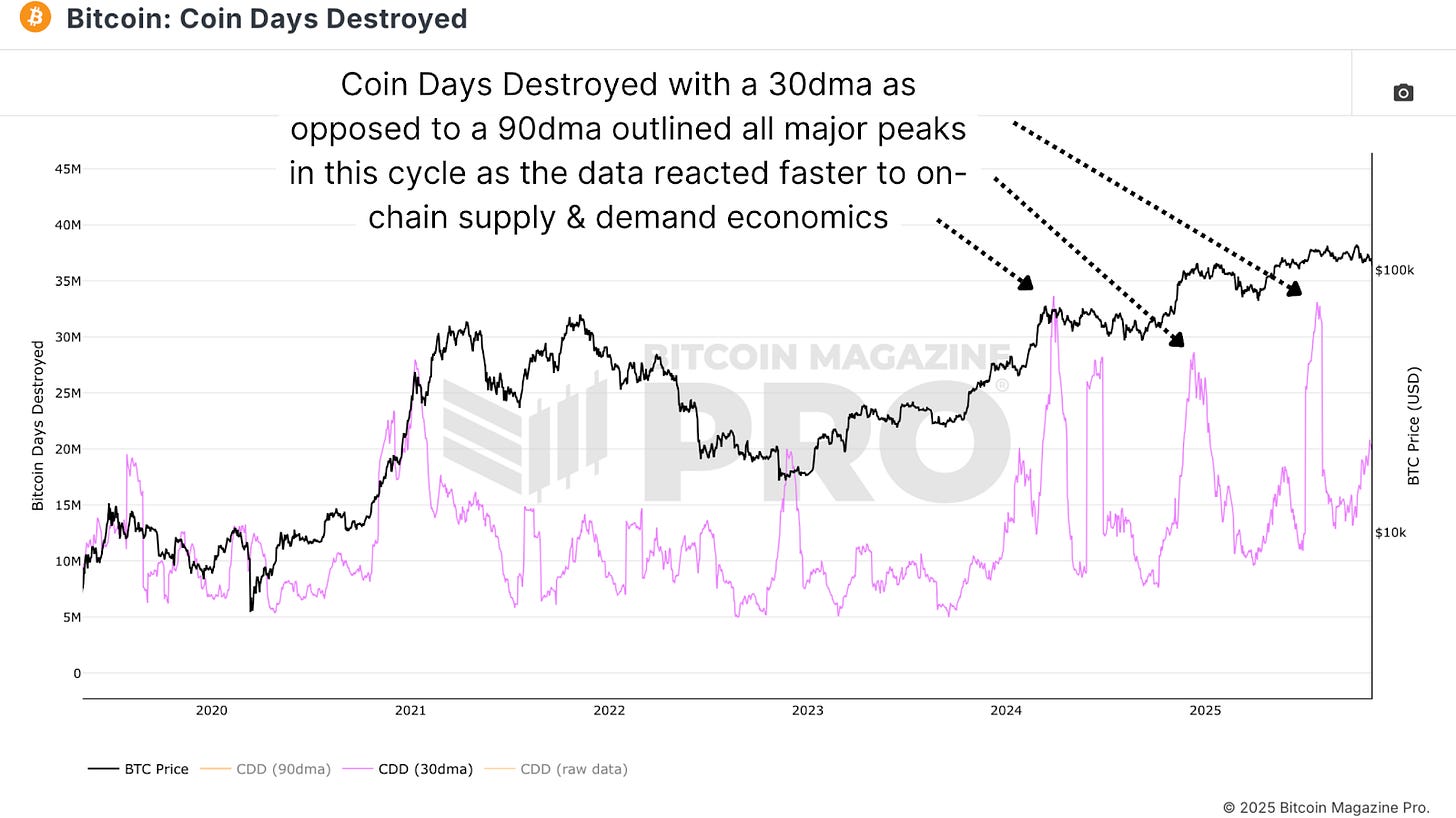 除估值工具外,链上活跃度指标如Coin Days Destroyed,通过缩短回溯周期也能显著提升实用性。Coin Days Destroyed 的90日均线曾能有效捕捉长期持有者的大规模分布,但当前周期波动减弱、走势反复,30日均线反而更具洞察力。随着比特币不再出现抛物线上涨,指标需更快响应,以反映当前虽幅度较小但依然重要的获利了结和投资者资金轮动。