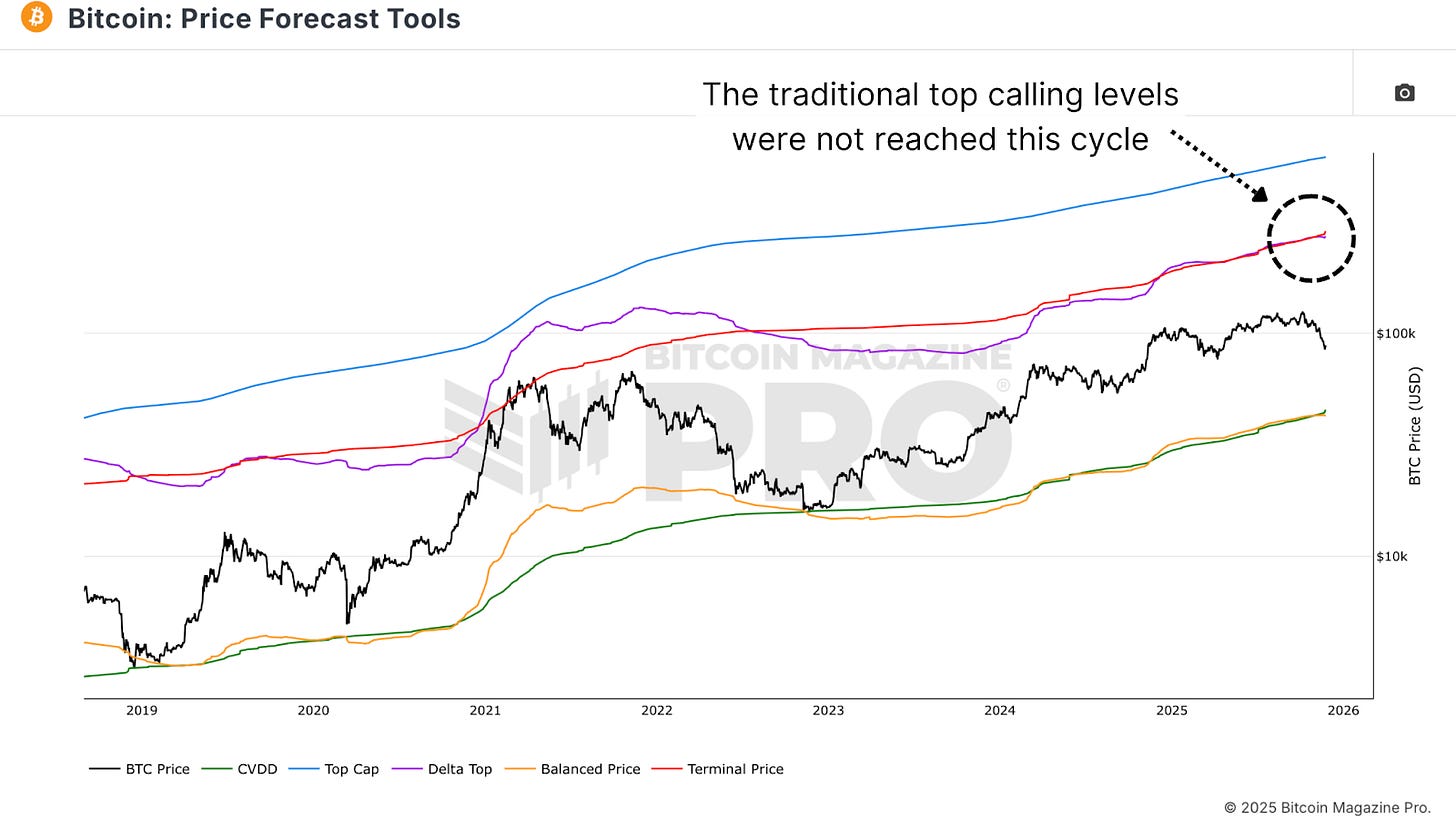 在 Bitcoin Magazine Pro 的价格预测工具指标中,本轮牛市始终未触及诸如 Delta Top、终端价格(Terminal Price)和顶部市值(Top Cap)等历史上表现可靠的顶部模型,顶部市值(Top Cap)在上一个周期也未被触及。采用2年均线乘以5的Bitcoin Investor Tool同样未被验证,Pi Cycle Top Indicator尽管备受关注,却未能给出有效的时点或价格信号。这引发了市场对于这些模型是否失效,或比特币市场行为已超越其适用性的合理疑问。