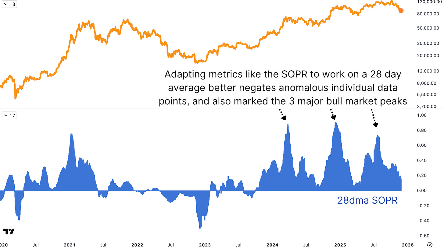 图5:对 SOPR 指标应用28日均线可平滑数据、降低噪音,并精准识别局部顶部。