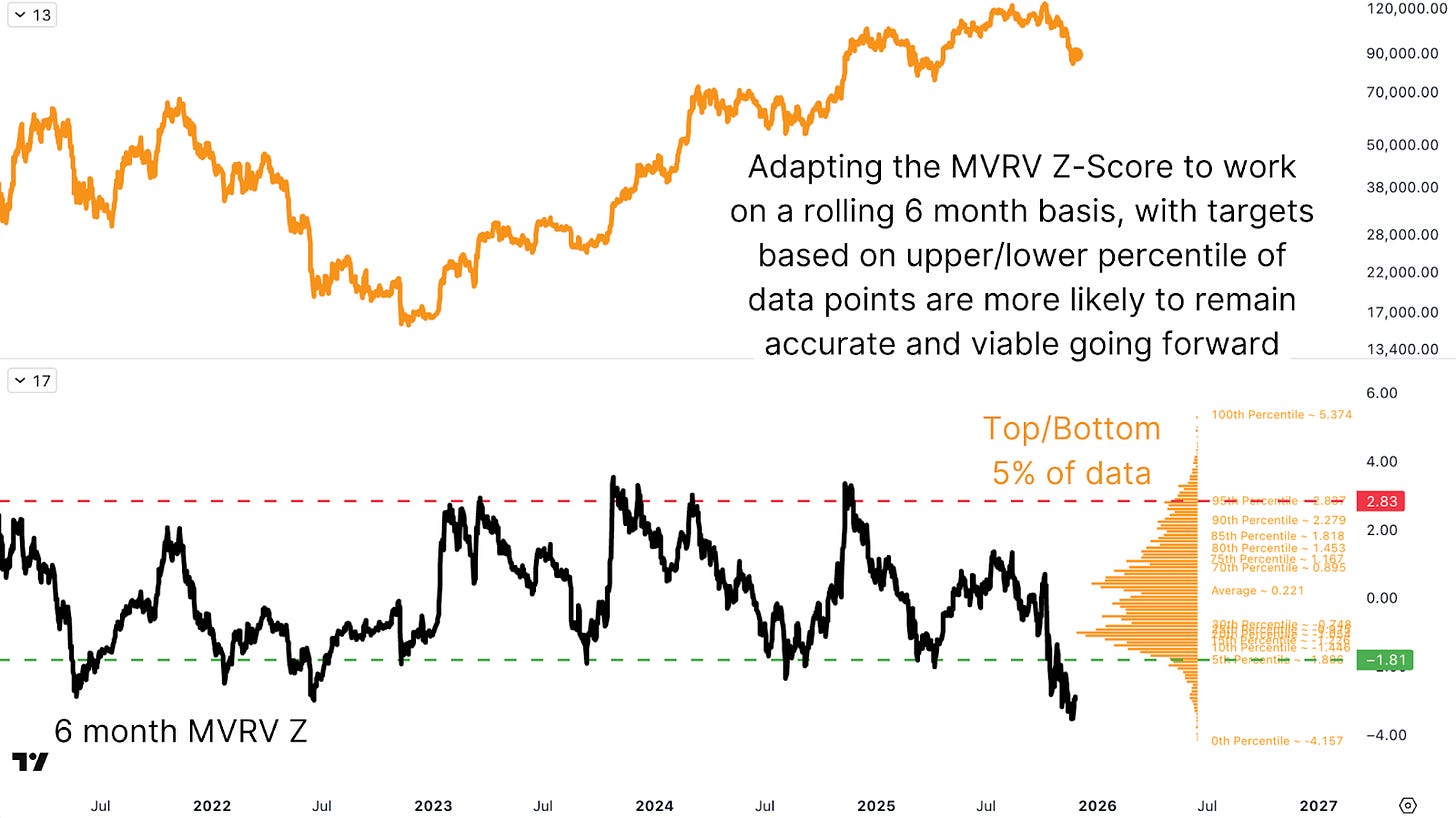 图3:经过6个月再校准的 MVRV Z-Score,结合上下分位数区间,可更及时地提示买卖信号。