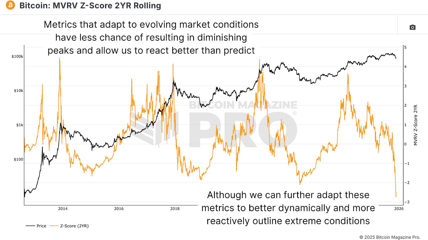 MVRV Z-Score 2年滚动一直被视为识别市场过热的重要工具,但本周期未能准确提示牛市顶部。该指标在比特币首次突破 $73,000–$74,000 区间时大幅上升,却未能为后续行情提供明确的离场信号。目前,该指标已达到历史上最极端的超卖状态。