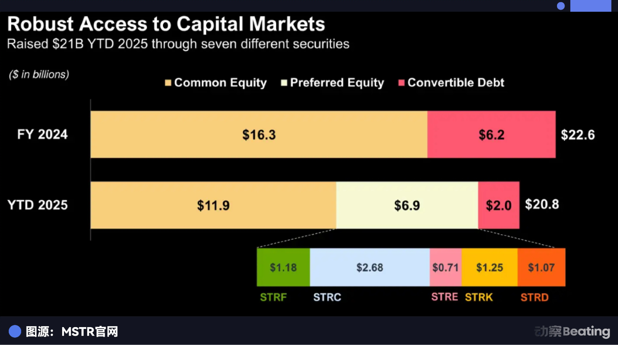 MSTR 今年已募得 208 亿美元的高额资金,这个规模在美国上市公司的年度募资中极为罕见。资金来源分别为普通股 MSTR 119 亿美元、优先股 69 亿美元、可转债 20 亿美元。