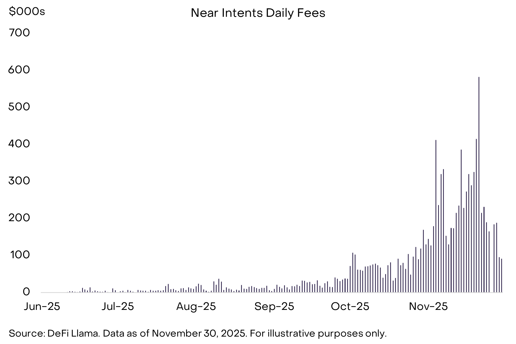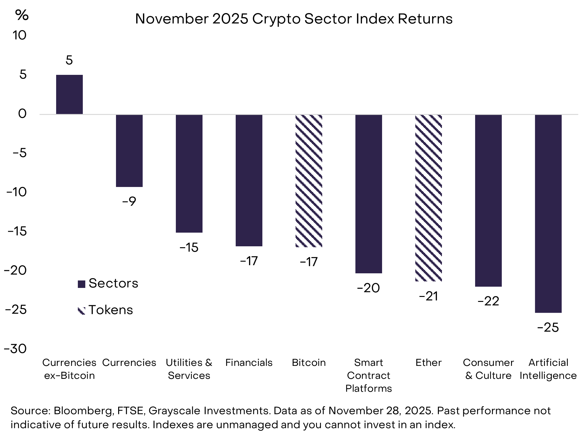 根据 Crypto Sectors 系列指数,11 月比特币价格跌幅在可投资加密资产中居中。表现最佳的板块为 货币类加密资产板块(见图 6)。除比特币外,该板块本月整体上涨。涨幅主要来自多种隐私币:Zcash(+8%)、Monero(+30%)、Decred(+40%)。[6] 以太坊生态也高度关注隐私:Vitalik Buterin 在 Devcon 大会发布隐私框架,Aztec(以太坊隐私 Layer 2)上线 Ignition Chain。[7]正如我们在 上月报告 中所述,Grayscale Research 认为区块链技术只有具备隐私要素,才能释放全部潜力。