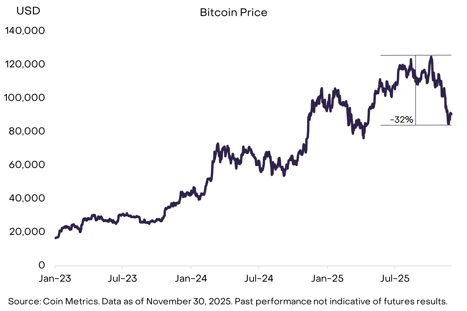 比特币投资历来回报丰厚,过去 3 至 5 年年均涨幅达 35%-75%。[2]但投资过程也伴随多次大幅回撤:比特币价格每年通常至少有三次下跌超过 10%。[3]如同其他资产,其投资回报本质上是对风险的补偿。长期持有者获得了丰厚回报,但也需承受周期性的显著调整。