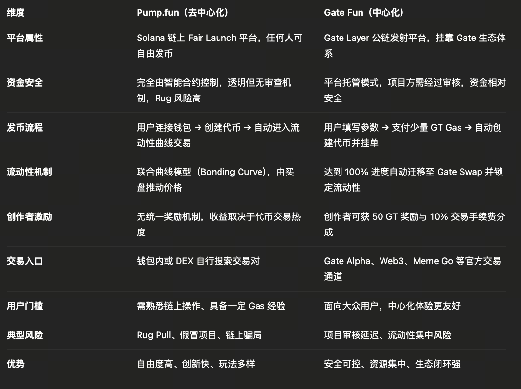 相比 Pump.fun 的“去中心化爆发”,Gate Fun 代表了一种“监管友好 + 流动性可控”的 Meme Launchpad 模式,也为中心化交易所打开了 Meme 生态的新入口。