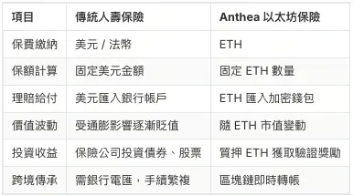 传统人寿保险以法币(美元、欧元等)计价,但 Anthea Holding 的产品将完全以 ETH(以太坊)计价,包括保费缴纳、保额计算与理赔给付。