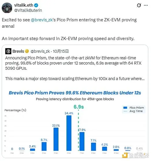 10月15日,Vitalik转推,并发文:“很高兴看到@brevis_zk的Pico Prism进入ZK-EVM验证领域!ZK-EVM验证速度和多样性迈出了重要一步。”