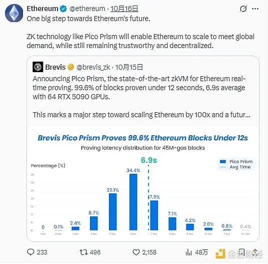 10月16日,以太坊官方账号转发Brevis发布的“Pico Prism”推文并配文:“这是迈向以太坊未来的一大步。像 Pico Prism 这样的零知识证明技术将使以太坊能够扩展以满足全球需求,同时仍然保持可信度和去中心化。”