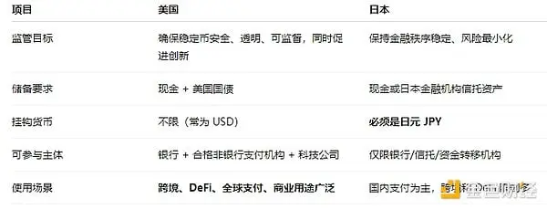 从监管环境而言,美国《稳定币法案》已明确储备资产需为现金或短期国债,发行方需持牌运营,监管标准清晰;而日本虽在2023年就已经修订《资金结算法》,允许发行稳定币,但强制要求与日元挂钩且应用场景受限,灵活性远低于美国市场。