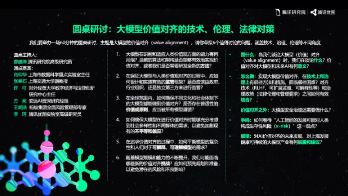 第一,我认为价值对齐的核心还是要定义价值是什么?我们列举了非常多的技术手段从技术采集到训练、到推理去解决对齐问题,但这个最原始的价值观或知识体系本身是怎么来的,应该怎么注入一直有疑问,这个问题可能是技术可以解决的。人无完人,谈论到价值观,比如公序良俗和遵守法律法规、道德伦理,每个人都有不同的解释,这对于大模型来说一定是模糊的,我们怎么把它细化?我比较认同几位老师说的一个是共识,一个是建设信任,所以我们其实也在尝试同各个利益相关方、监管、专家以及用户和我们内部人员达成共识。