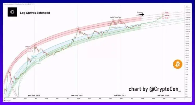 如图所示,比特币在下轮牛市周期(2024-2025 年)的历史高点,预计最早可能在 2024 年年中全面爆发: