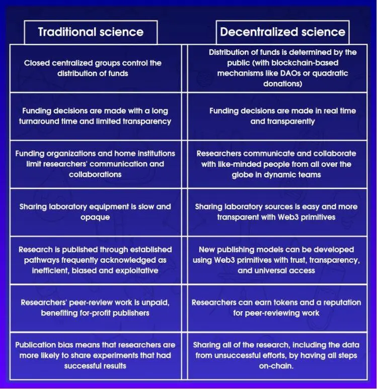 创新的 DeSci 有能力应对传统科学中存在的众多挑战。下图为 DeSci 对其中几个传统科学问题的解决。