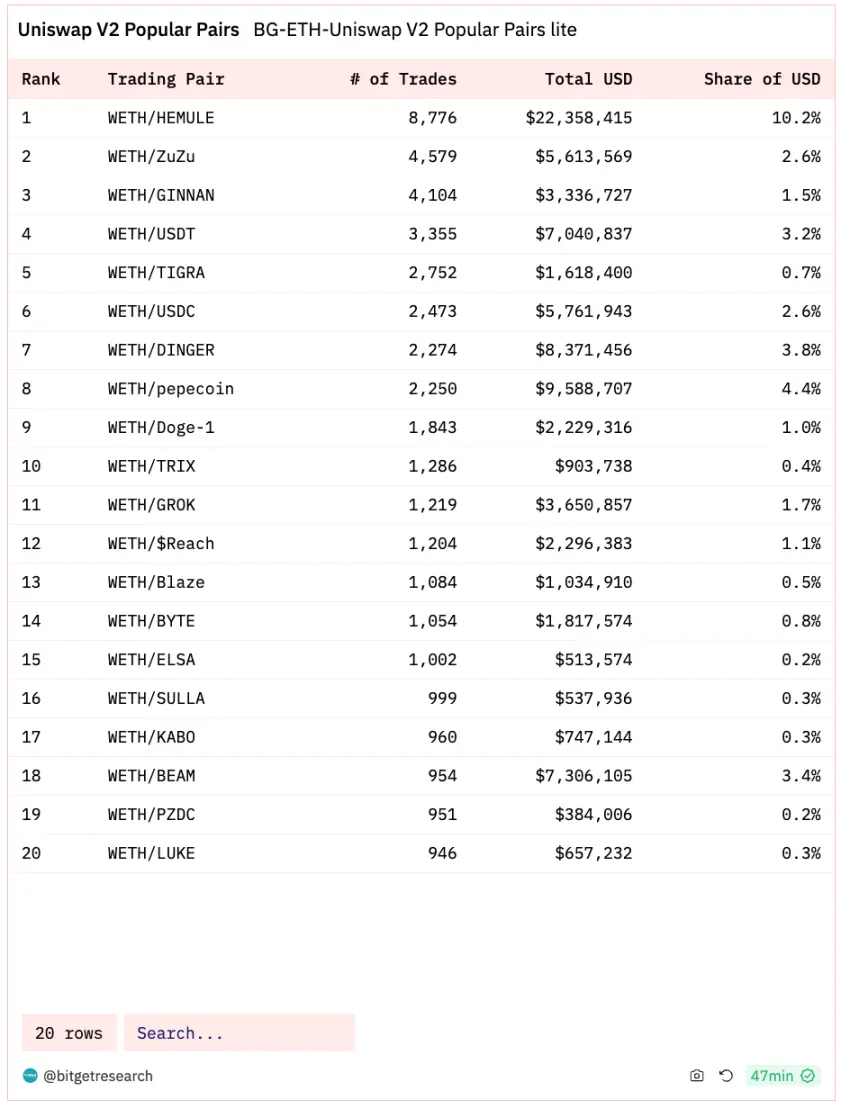 Hemule(Token): V 神的猫主题 meme,链上 Liquidity = 46 万美金,市值 7.2M 美金,24h 交易量 16M 美金,24h 交易笔数=6900 笔,合约权限已放弃,LP Token 已打入黑洞地址。