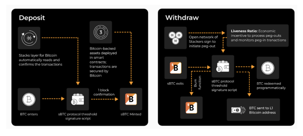 BTC 存入后,sBTC 在 Stacks 上被铸造,用户即可与 DeFi dApps 互动。